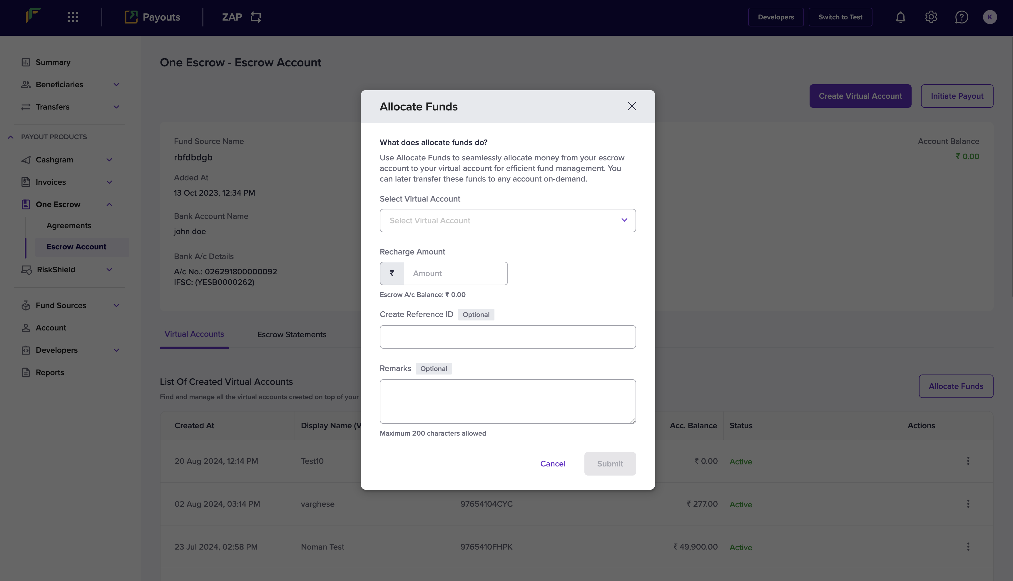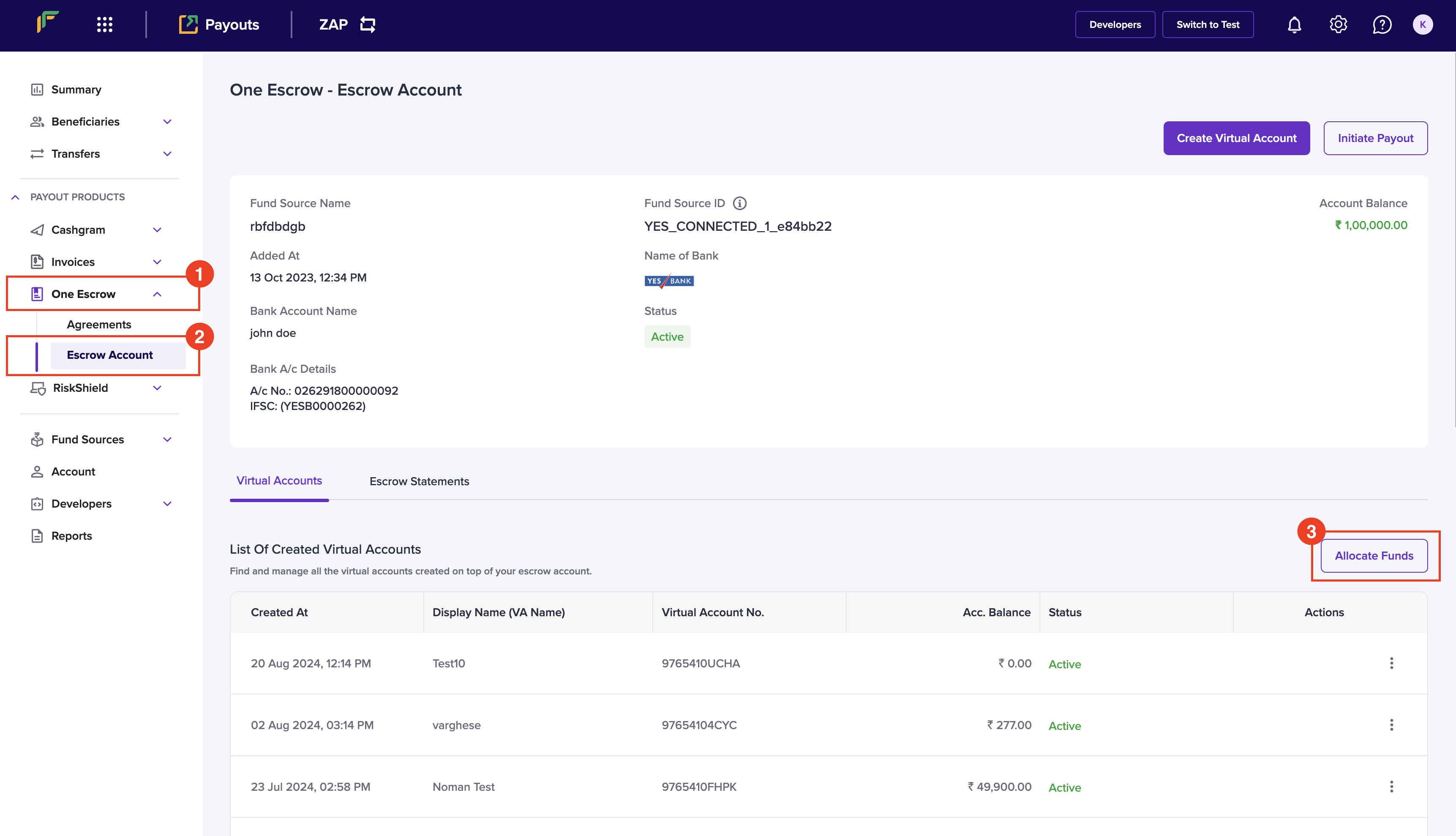 - Click Allocate Funds in the One Escrow - Escrow Account page.