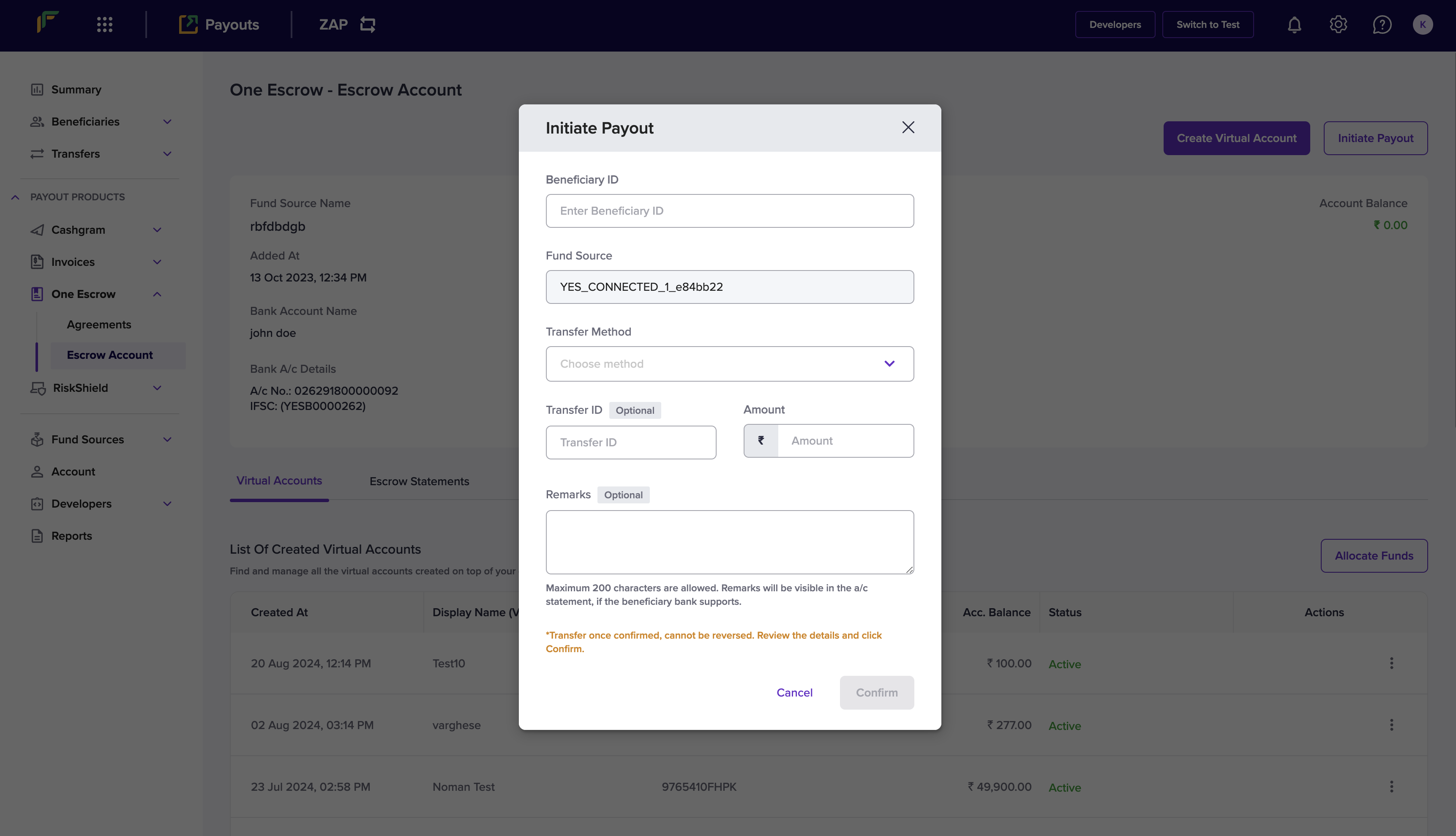 Follow the instructions below to initiate a payout from the virtual account:- Login to the Payouts dashboard using your credentials.