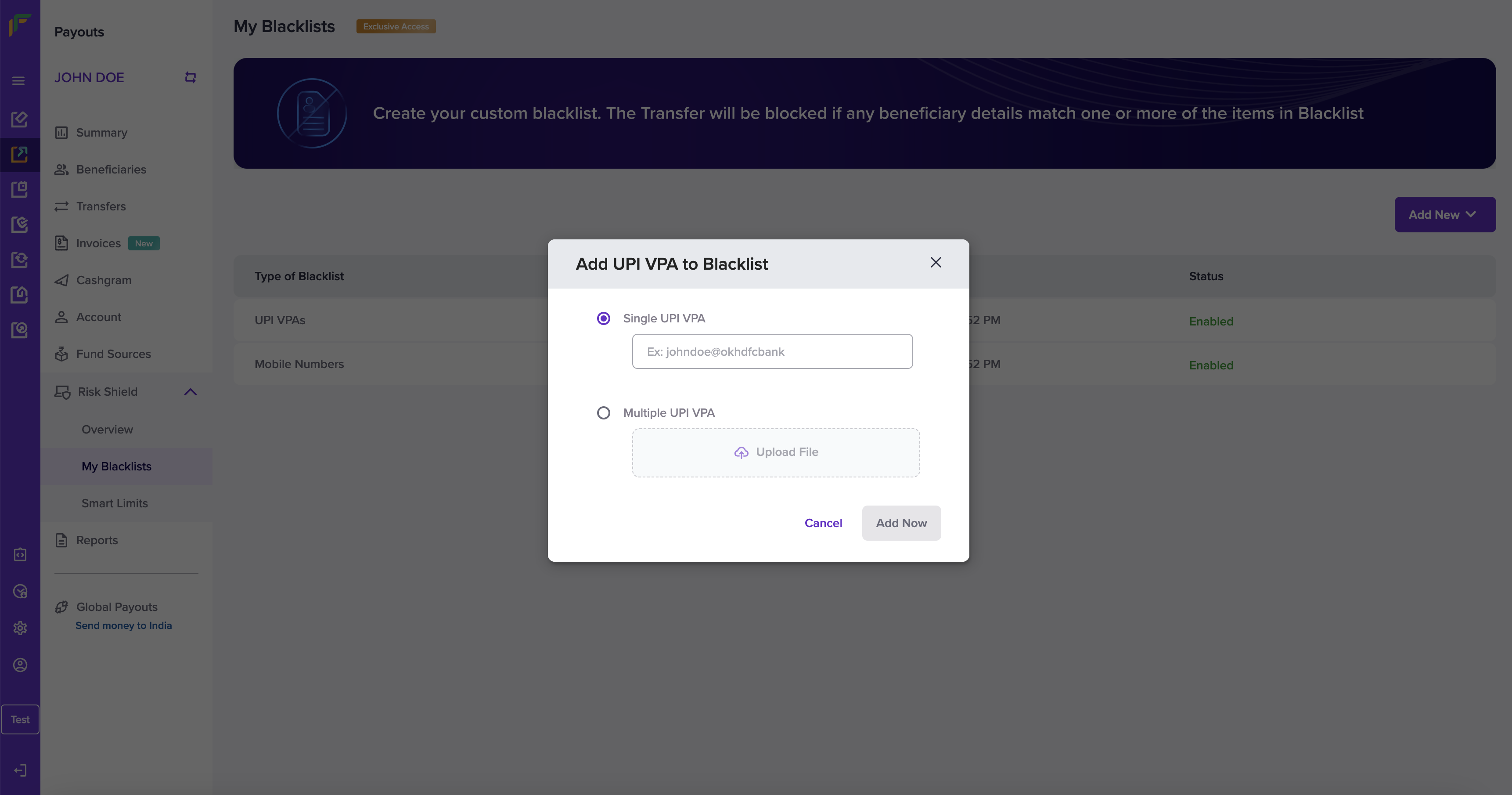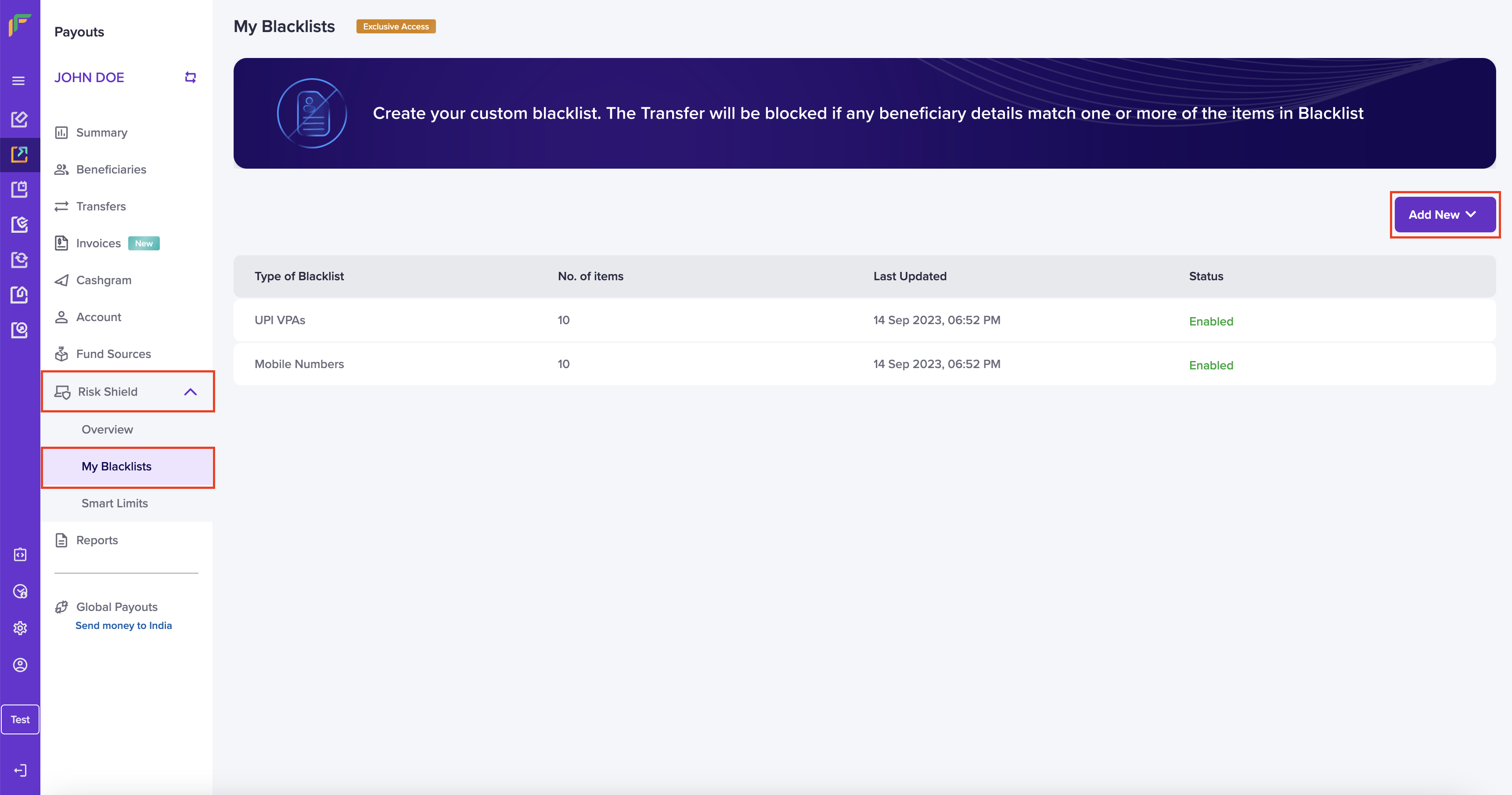 My Blacklists allows you to block a beneficiary by adding any of the information: mobile number, email ID, UPI VPA, and bank account. Once you login to the Payouts dashboard using your credentials, navigate to Payout Protect > My Blacklists.