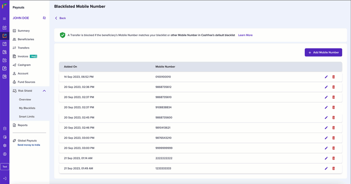 You can view the complete list of any blacklist type - Mobile Number, Email ID, UPI VPA, and Bank Account. The My Blacklists screen provides you with the information of each blacklist type. Click a blacklist type to view and drill-down it’s complete information.You can also add information of your beneficiary from the list screen of any blacklist type - mobile number, email ID, UPI VPA, and bank accounts.