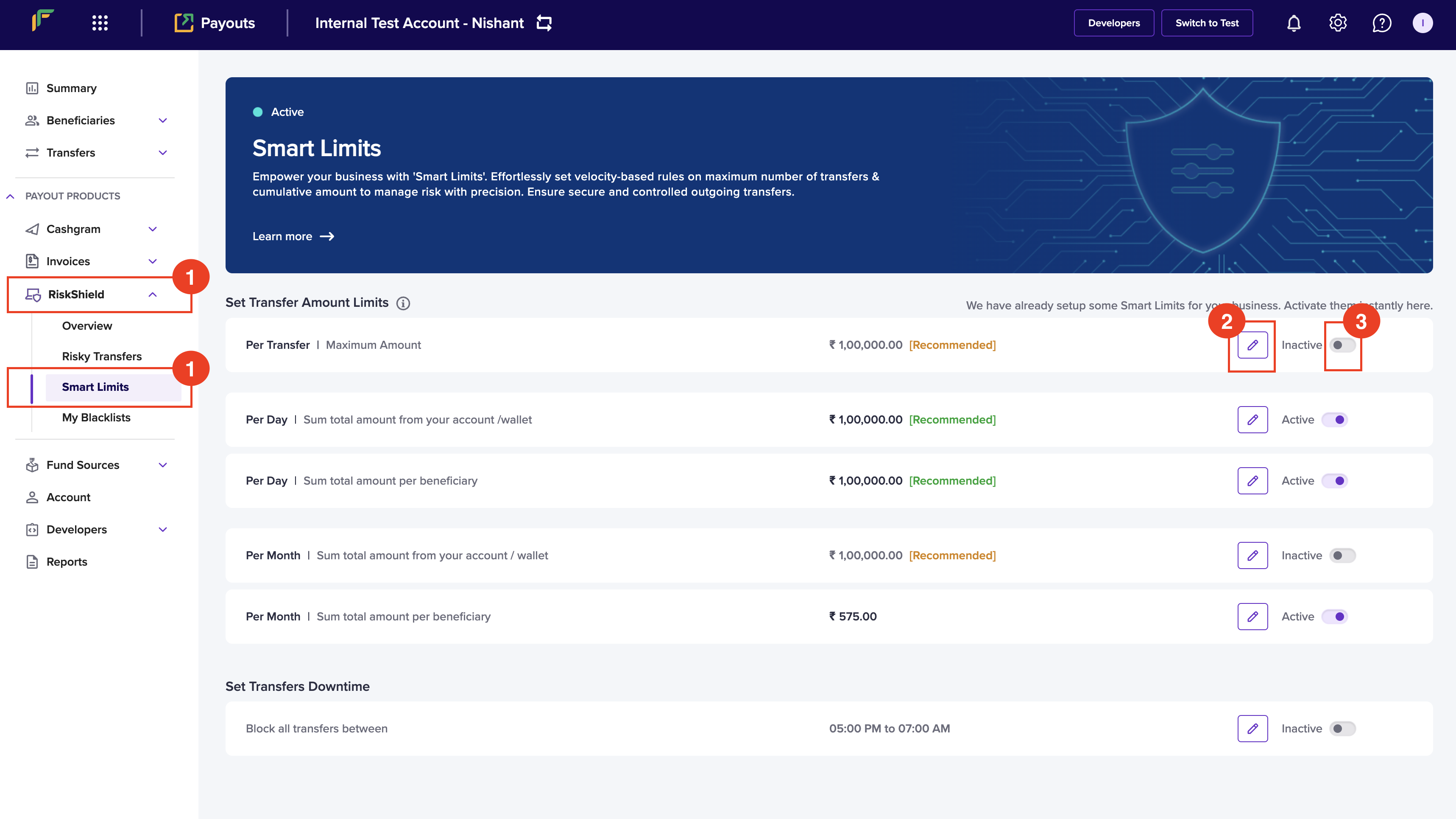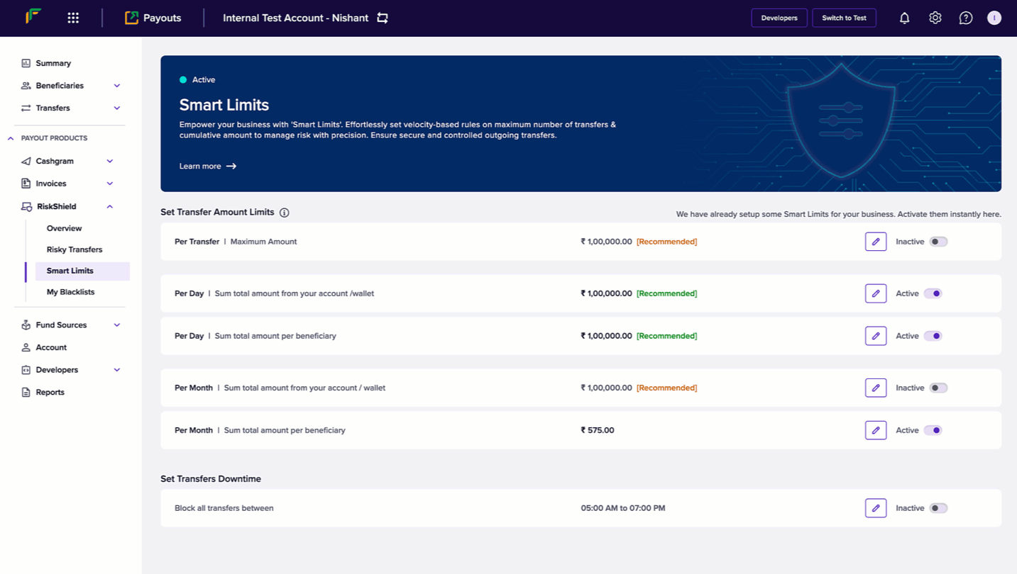 You can configure a specific time when you donβt want to allow any payouts. Follow the instructions below to schedule a time that blocks transfers:- Once you login to your Payouts dashboard using the credentials, navigate to Payout Protect > Smart Limits > Set Transfers Downtime.